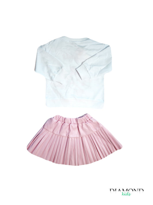 €11,00 EURSaldi €9,99 EUR( stagione Autunno Inverno ) Completo composto da felpa e gonna. Felpa bianca con stampa frontale. Gonna in similpelle rosa a balze, con elastico in vita. Composizione: 80%cotone 20%poliestere ...9% OFF -